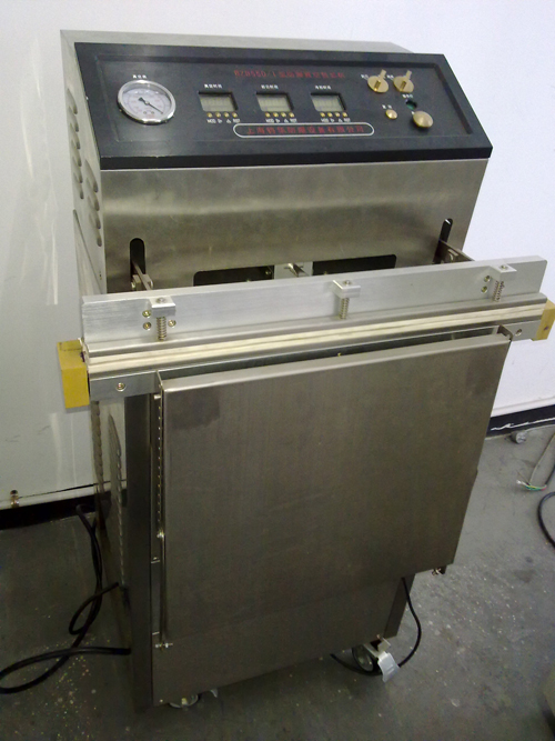 该真空包装机不采用腔式工作室,而是使包装体本身起腔式作用,把包装物装进复合塑料袋内,将包装袋放在工作台上,再套上包装机的抽气嘴上,然后启动机器,由上压块下压,压着袋口封闭后,打开真空泵,抽至预制的真空度,加压、加热使包装袋口封合。以上动作程序,均由微电脑智能控制器自动控制完成。另外,设备底部安装有4个万向轮,移动灵活方便。